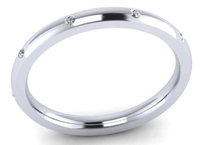 Loading... Please wait...G108 Invisible set diamond wedding ring:- The ring design is a classic 2mm court shape with small diamonds spaced equally around the ring. With 9 x 1.3mm brilliant cut (round) diamonds, Colour G, VVS clarity, set in an invisible setting. Perfect for the customer wanting as near as possible to a plain band but with a little added extra, court shaped rings are rounded on the outside and rounded on the inside, each diamond is hand measured, symmetrically cut for maximum sparkle, every stone matching to get that perfect invisible setting.
