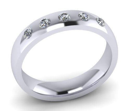 Loading... Please wait...G42 Invisible set diamond wedding ring:- This design is shown on a 4mm court shaped ring set with 5 x 2.3mm Brilliant cut (round) diamonds all 5 diamonds are invisibly set and spaced across the top third of the ring. The diamonds are Colour G, VVS clarity. Court rings are rounded on the outside and rounded on the inside for maximum strength, each diamond is hand measured, symmetrically cut for maximum sparkle, every stone matching to get that perfect setting. This ring is also available in a flat top court shape.