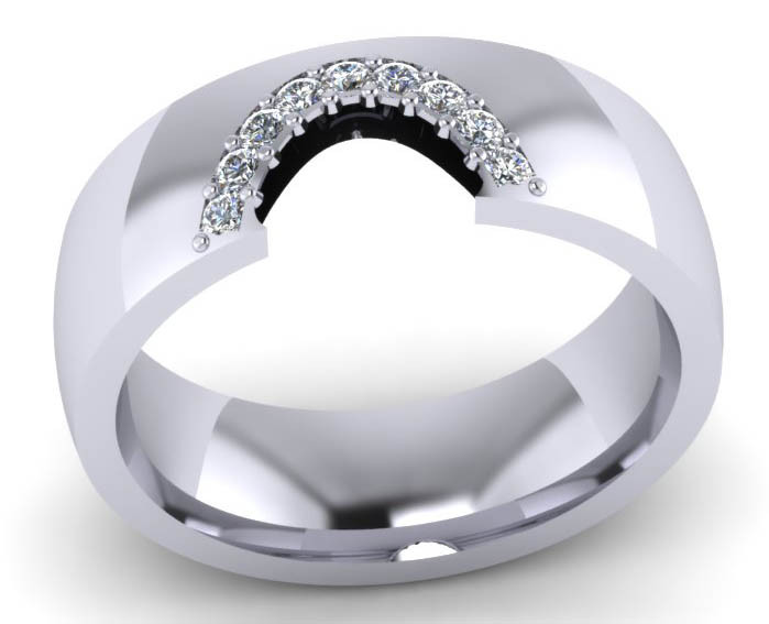 Loading... Please wait...G62 Pave set cut out diamond wedding ring:- The modern shaped pave set cut out design for fitting to your engagement ring, 6mm court with 9 x 1.3mm brilliant cut (round) diamonds, Colour G, VVS clarity, set in a beautiful pave setting framing the cut out. Perfect for the customer wanting the diamond ring with a timeless look with out the trouble of it not fitting, we will need your engagement ring for a short time to get the correct depth for the cut out. Court rings are rounded on the outside and rounded on the inside, each diamond is hand measured, symmetrically cut for maximum sparkle, every stone matching to get that perfect pave setting.