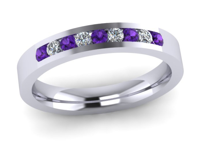 3MM Flat Comfort Fit shape Eternity ring channel set with 9x1.8 mm stones 5 brilliant cut amethysts and 4 brilliant cut diamonds colour G Clarity VS - Total stone weight 0.27ct Eternity Rings