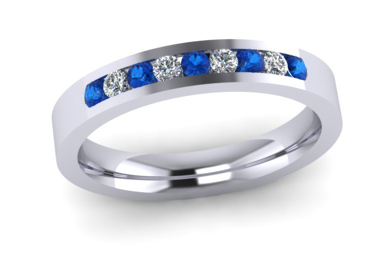 3MM Flat Comfort Fit shape Eternity ring channel set with 9x1.8 mm stones 5 brilliant cut Ceylon sapphires and 4 brilliant cut diamonds colour G Clarity VS - Total stone weight 0.27ct Eternity Rings
