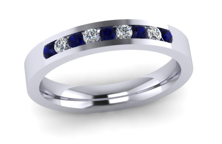 3MM Flat Comfort Fit shape Eternity ring channel set with 9x1.8 mm stones 5 brilliant cut dark blue sapphires and 4 brilliant cut diamonds colour G Clarity VS - Total stone weight 0.27ct Eternity Rings