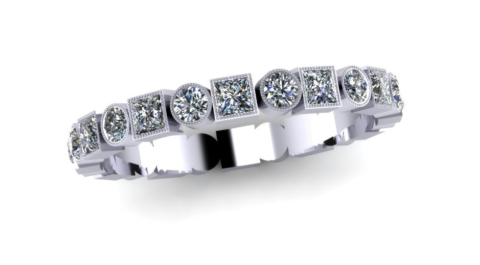 Loading... Please wait...G151 RUBOVER SET ROUND AND SQUARE DIAMOND RING This full diamond ring is set with round and square diamonds in a rubover setting with a millgrain edge on each diamond. The solid band is set with 2mm size diamonds, colour G, clarity VVS diamonds. Each diamond is hand measured, symmetrically cut for maximum sparkle, every stone matching to get that perfect look. This design is also available with 1.5mm, 1.8mm, 2.3mm, 2.5mm and 3mm diamonds. Call us for a quote for these different sizes. 0207 405 7590 or goldfingerrings@gmail.com We set all our diamonds in a heavy weight ring for protection of the diamonds and your ring will not have holes underneath the diamonds on the inside of the band for added strength and comfort. You can also make this design with diamonds on the top third or half way round and then add morediamonds later on. All our rings are handmade in our UK workshops by British Craftsmen. All our jewellery includes a free engraving message inside the ring, this option has a box for you to write your messages as you are making payment, maximum of 25 spaces block lettering. Goldfinger also includes in all its purchases a complimentary ring box to ensure the safe keeping of your rings on their travels and up until your special day. Every stone is measured, symmetrically cut for maximum sparkle, every stone matching.
