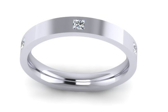 Loading... Please wait...G49 Invisible set diamond wedding ring:- This Classic 3mm flat design has 6 Princess cut diamonds equally spaced around the ring. The 6 x 1.5mm Princess cut (square) diamonds are invisibly set and the diamonds are Colour G, VVS clarity. Perfect for the customer wanting not just a plain band but a little something extra with this diamond set wedding ring. The band is a flat top court shaped ring flat on the outside and rounded on the inside for extra strength, each diamond is hand measured, symmetrically cut for maximum sparkle, every stone matching to get that perfect invisible setting. This design is also available with round diamonds or on a rounded court shape.