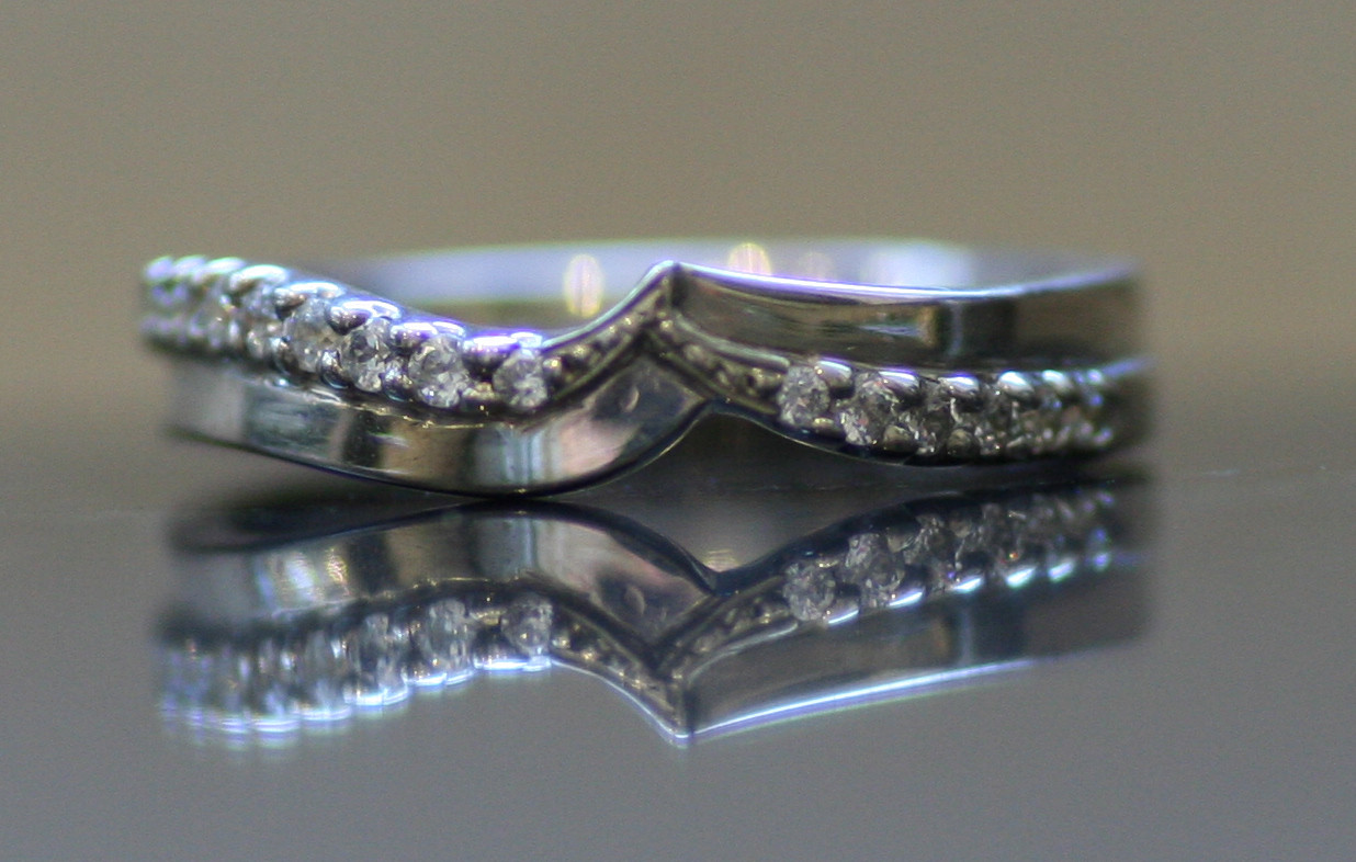 Loading... Please wait...G150 Hook Shaped micro claw set Brilliant Cut Diamond wedding ring:- This ring is a solid 3mm court design shaped to fit and set with 14.1.3mm brilliant cut diamonds. It is made to fit with a twisted shape engagement ring. Personal fitment is available. Each diamond is symmetrically cut and hand sorted so they match perfectly to give maximum sparkle in this beautiful ring. We set all our diamonds in a heavy weight ring for protection of the diamonds and your ring will not have holes underneath the diamonds on the inside of the and for added strength and comfort. Symmetrically cut diamonds get their shine form their cut which is why we can enclose the diamonds and they still sparkle. All our rings are handmade in our UK workshops by British craftsmen. All our jewellery includes a free engraving message inside the ring this option has a box for you to write your messages as you are making payment, maximum of 25 spaces block lettering. Goldfinger also includes in all its purchases a complimentary ring box to ensure the safe keeping of your rings on their travels and up until your special day measured, symmetrically cut for maximum sparkle, every stone matching.