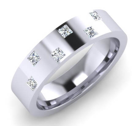 Loading... Please wait...G70 Invisible set mens diamond wedding ring:- The modern design for men with 6 diamonds on the top of the ring invisibly set, 5mm flat top court with 6 x 1.8mm princess cut (square) diamonds Colour G, VVS clarity. Perfect for the customer wanting a hard wearing diamond set wedding ring , flat top court shaped rings are flat on the outside and rounded on the inside for extra strength and comfort, each diamond is hand measured, symmetrically cut for maximum sparkle, every stone matching to get that perfect invisible setting.