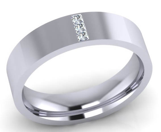 Loading... Please wait...G63 Raised Channel set mens diamond wedding ring:- The modern design for men with 3 diamonds on the top of the ring across the centre in a channel set, the ring is a 6mm flat top court with 3 x 1.8mm princess cut (square) diamonds, Colour G, VVS clarity. Perfect for the customer wanting a hard wearing diamond set wedding ring , flat top court shaped rings are flat on the outside and rounded on the inside for extra strength and comfort, each diamond is hand measured, symmetrically cut for maximum sparkle, every stone matching to get that perfect channel setting.