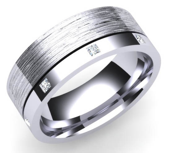 Loading... Please wait...G93 Grain set mens diamond wedding ring:- This Purdey designer ring has been designed with a brushed finish on the larger part of the ring with a smaller shiny section set with 8 x 1.8mm Brilliant Cut (round) diamonds equally set around the ring in a square grain setting to give the look of Square diamonds. The ring is 7mm wide and the diamonds are Colour G, VVS clarity. Perfect for the customer wanting a hard wearing diamond set wedding ring , flat top court shaped rings are flat on the outside and rounded on the inside for extra strength, each diamond is hand measured, symmetrically cut for maximum sparkle, every stone matching to get that perfect invisible setting.