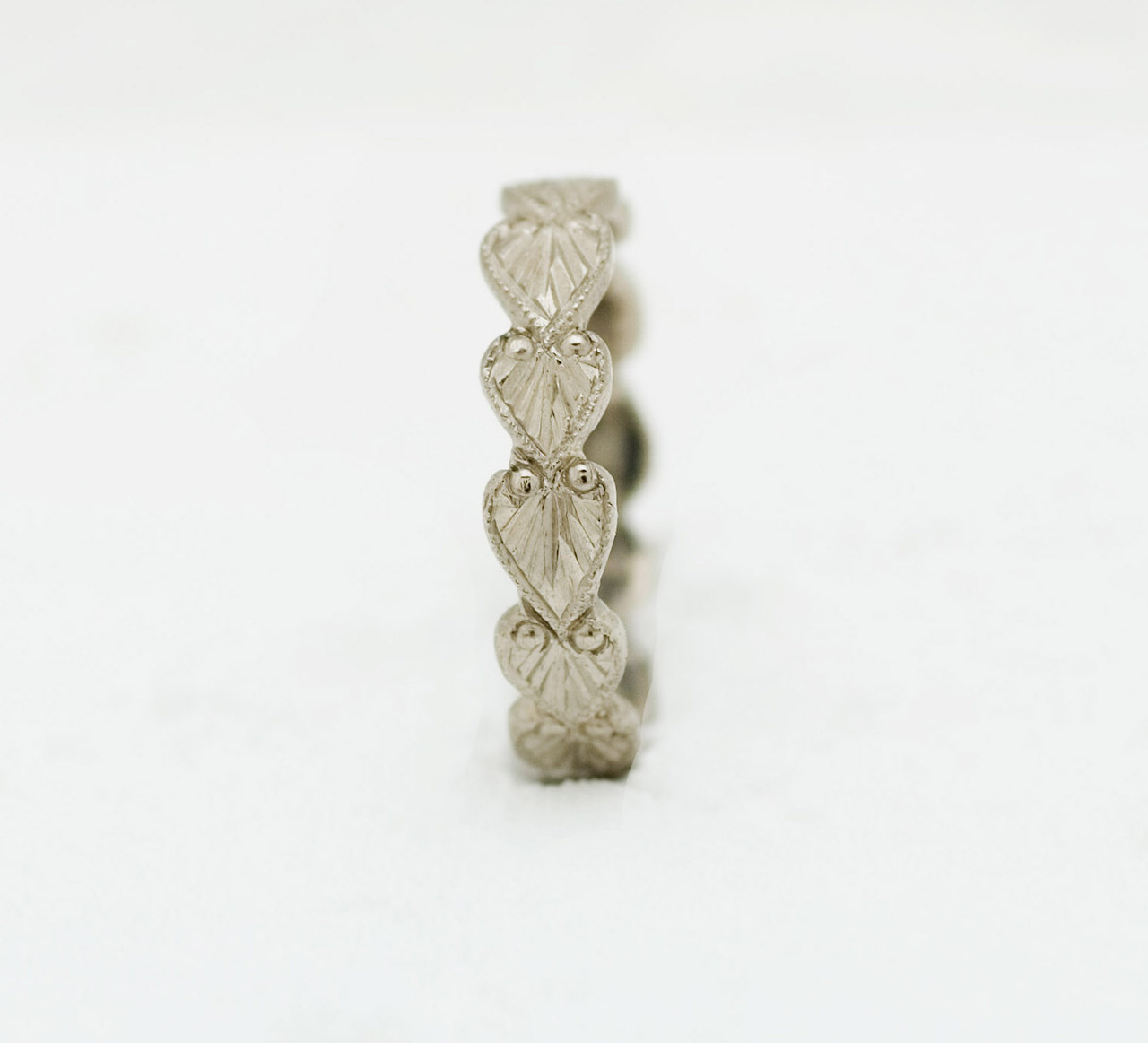 Loading... Please wait...GF2077 Purdey Designer Hand Engraved Wedding Ring this heart shaped wedding ring is hand engraved to highlight each heart. The design can be made on a flat shape or flat top court shape ring and can be ordered from 3mm to 8mm in width. If you have any questions please call us on 0207 405 7590 01403 733638 or e-mail goldfingerrings@gmail.com