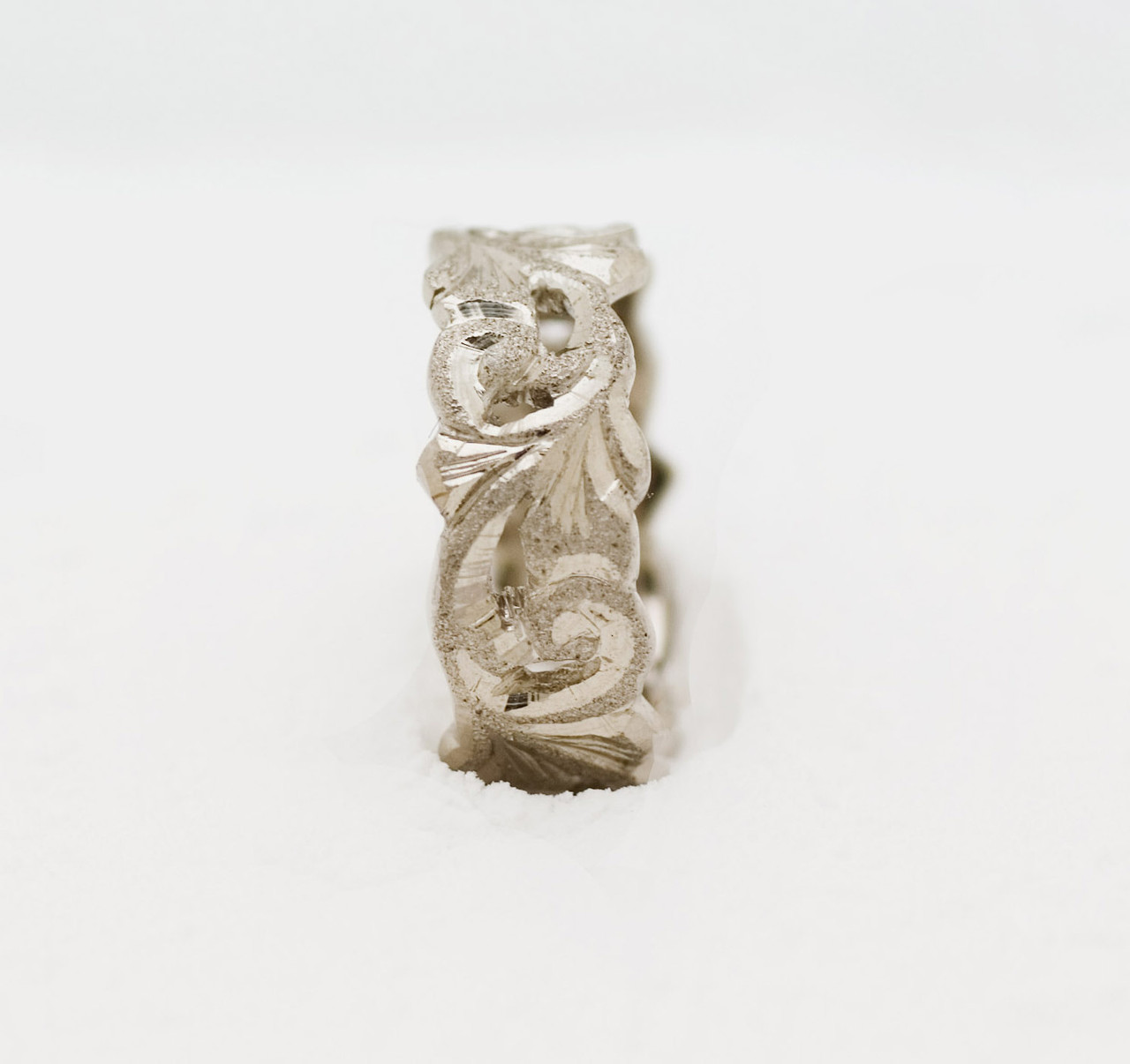 Patterned Rings We have a huge selection of sample patterned rings, as well as his & hers wedding rings. We have added some of our simpler designs to this selection of the website but we have so stunning unique designs for old vintage hand engraved to contemporary lines and brushes. We have a wide range of Celtic designs, Roman numerals, leaf patterns, hand engraved, Vintage rings, Mill grain edge, edge patterns, Chinese symbols, Dots and Dashes, logos (batman, Ironman, Football, family crest etc ) and so much more. Contact us on 0207 405 7590 or Email info@goldfingerrings@gmail.com to book you free consultation at your home or in our Hatton Garden workshop.
