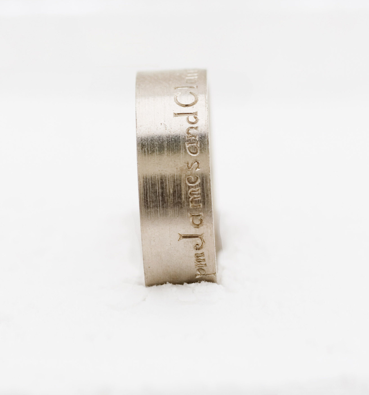 Loading... Please wait...G423 Purdey designed Message Wedding Ring this design will appeal to the customer who wants help remembering their anniversary. The small message runs around the whole of the ring but is set off centre to give a plainer ring look. You need your message to be around 45 characters to complete the circle. Less than 45 characters and you may have a small plain gap on the ring. Your message could have your names, wedding date, wedding time, venue of the wedding etc. or a line from the wedding service. Just write your message in the engraving box when you pay and put in brackets (outside) so we know you want this message on the outside of your ring. This design looks best on a 4mm to 8mm width ring. The picture is showing a 7mm wide design on a flat top court shape. If you have any questions please call us on 0207 405 7590 01403 733638 or