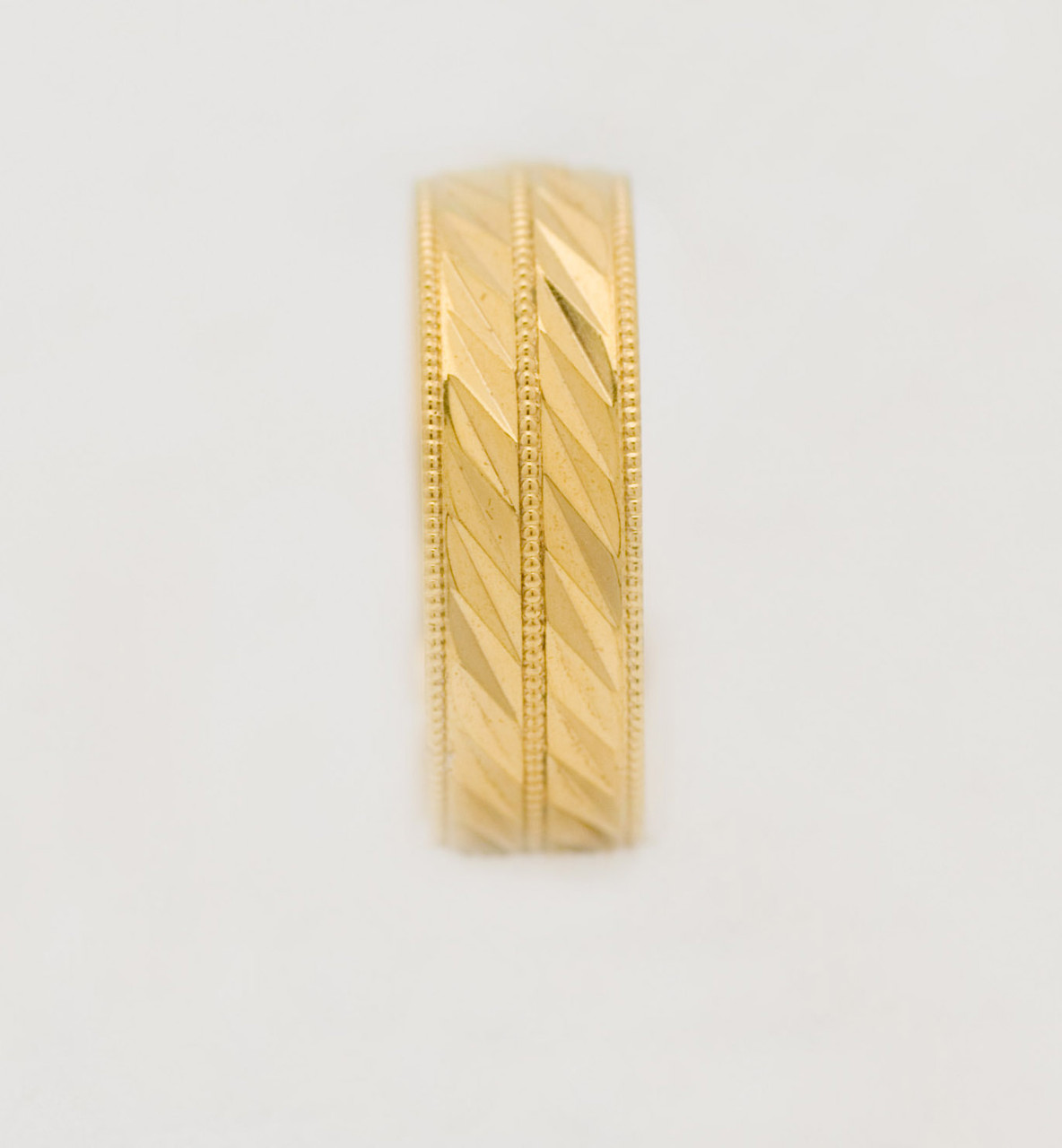 Loading... Please wait...GFRG9 Diamond Cut Wedding Ring 7mm this diamond cut design gives a shiny effect and is divided by a millgrain line in the middle and one on each edge. The picture is showing a 7mm width ring but the design looks good on a 5mm to 8mm width ring. This design is shown on a flat top court shape ring for maximum strength and comfort but is also available on a flat shape ring.