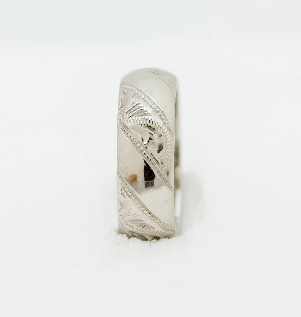 Loading... Please wait...HD85G Hand Engraved Wedding Ring 7mm this design has a plain section and then a hand engraved section alternating around the ring. The picture is showing a 7mm width ring but the design looks good on a 3mm to 8mm width ring. This design is shown on a court shape ring for maximum strength and comfort but is also available on a D shape, flat or flat top court shape.