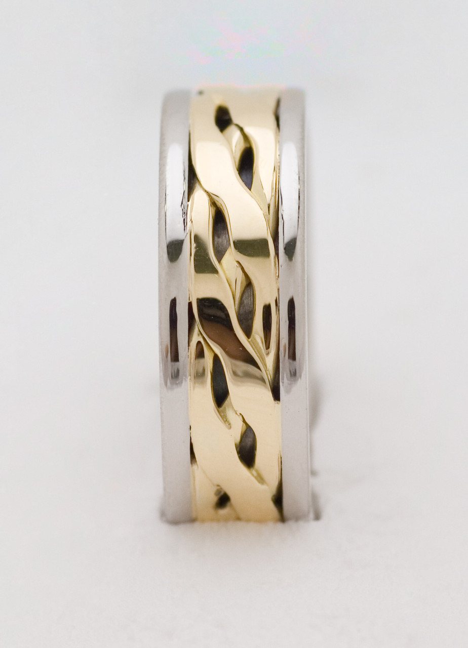 Loading... Please wait...WW148 TWO COLOUR WEDDING RING this ring has a solid outer ring with an open twisted centre in a contrasting colour. The picture shows a 7mm ring. It is available in various colour and width combinations but the narrower the ring the smaller the holes in the centre become. Make your choice from the appropriate boxes to get a price.