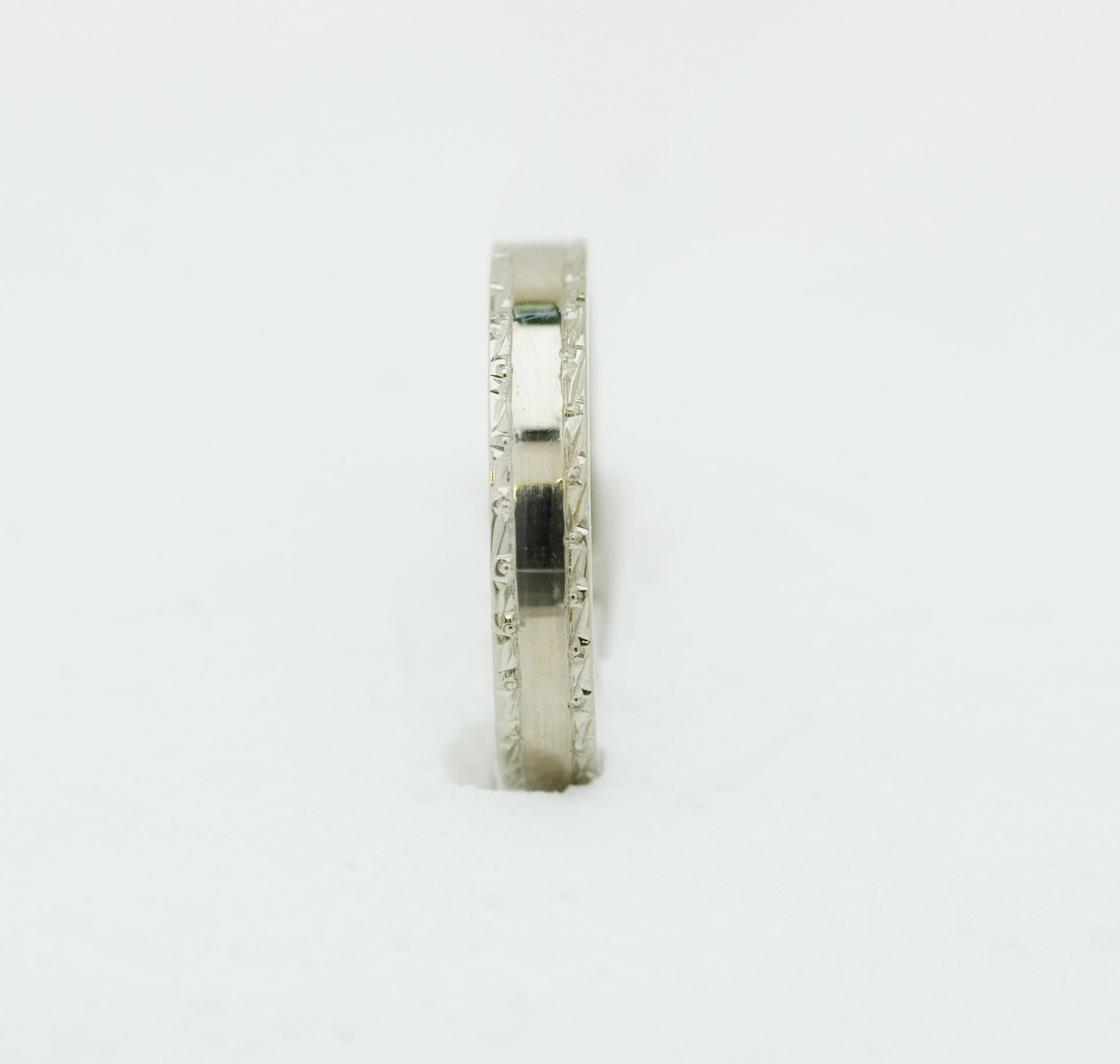 Loading... Please wait...AB32P Hand Engraved Wedding Ring this ring has a hand engraved edge with a plain polished centre. The picture is showing a 3mm wide ring but the design looks good from 2mm to 8mm wide. This design is shown on a flat top court shape ring for maximum strength and comfort but is also available on a rounded court shape, D shape or flat ring.